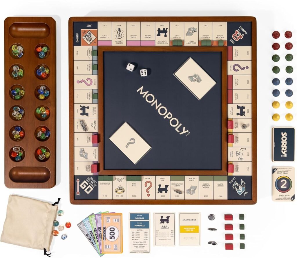3-in-1 Wooden Set with Reversible Board and Integrated Storage. This set is Monopoly, SORRY! and Mancala all together in one high quality, durable set.
