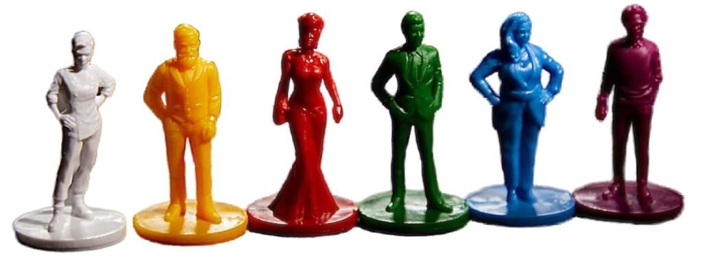 Mrs. White — Colonel Mustard — Miss Scarlett — Reverend Green — Mrs. Peacock — Professor Plum